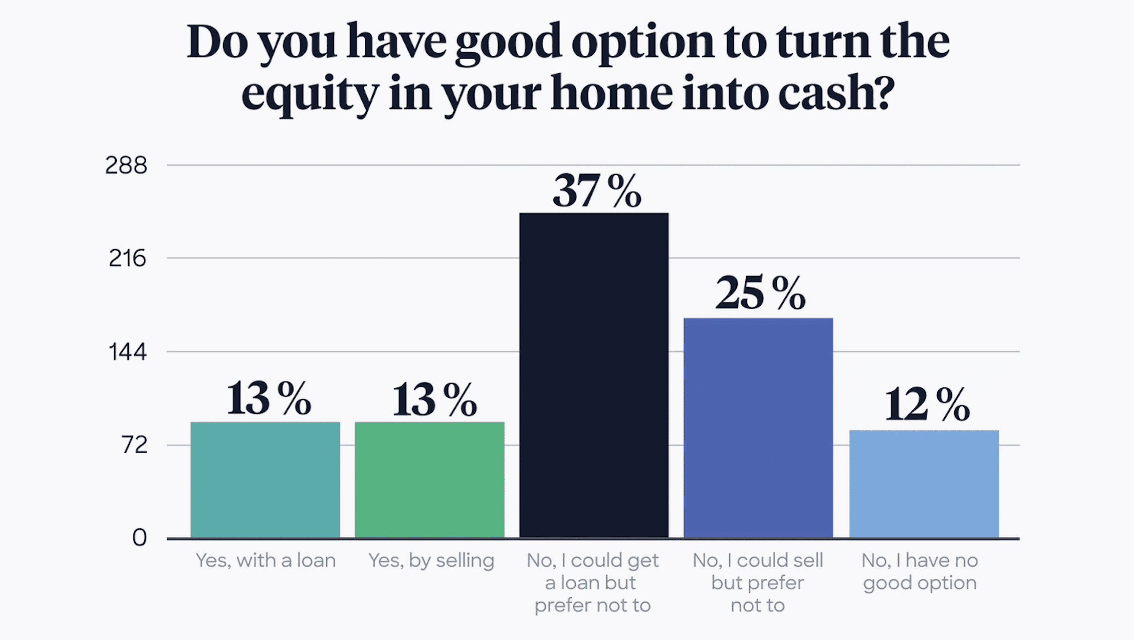 According to Hometap’s 2019 Homeownership Survey, when asked how homeowners feel about their options for accessing their home equity, 37% of homeowners answered that while they could get a home equity loan, but prefer not to, while 12% said they have no good options at all for turning the equity in their homes into cash.